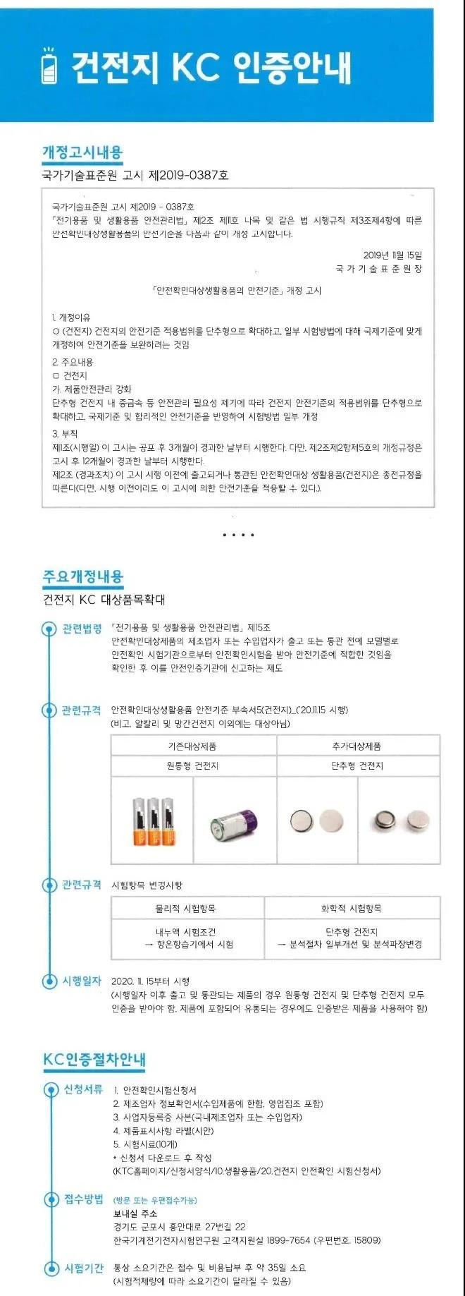 近日,韓國修訂了《電器及家居用品安全管理法》,首次將紐扣干電池列入KC認證管控范圍,該項規定從2020年11月15日開始生效,其管制范圍包括圓柱形電池和紐扣電池,同時如果終端產品內含有圓柱形電池以及紐扣電池,其使用的電池也必須經過KC認證后,方可進入韓國市場售賣。