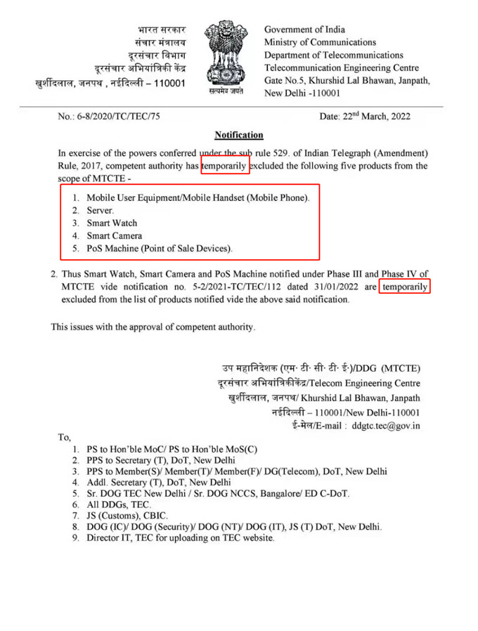 2022年3月22日,印度TEC發(fā)布通知,暫將如下五種產(chǎn)品排除在其認(rèn)證范圍之外:1、移動(dòng)用戶設(shè)備/移動(dòng)電話(手機(jī));2、服務(wù)器;3、智能手表;4、智能相機(jī);5、POS機(jī)